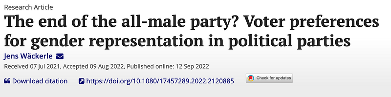 Wäckerle, Jens. “The End of the All-Male Party? Voter Preferences for Gender Representation in Political Parties.” Journal of Elections, Public Opinion, and Parties, vol. 33, no. 4, 2023, pp. 726–45, doi:10.1080/17457289.2022.2120885.