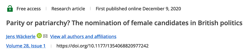 Wäckerle, J. (2022). Parity or patriarchy? The nomination of female candidates in British politics. Party Politics, 28(1), 10–23.